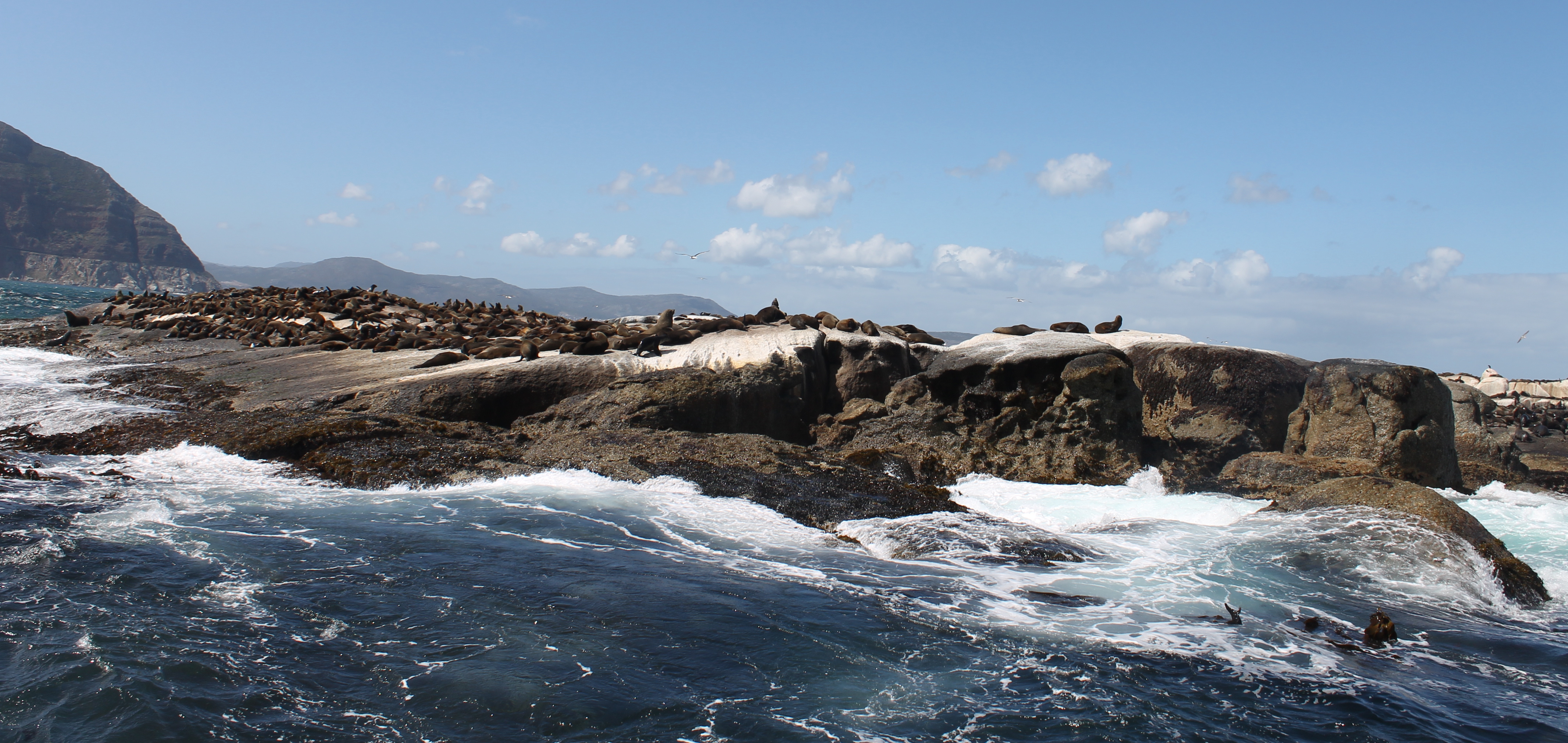 So, I left off on Thursday. That day, Caroline and I went on a tour that took us down the Cape and all the way to Cape Point. It was a beautiful day – nice and sunny. A perfect day in South Africa. Our first stop was “seal island” (or seal rock, really, as someone else said), which we visited by boat. I was very excited to see some seals after spotting a couple of them in the harbour of Cape Town the day before. And it was pretty awesome. There were so many of them, some sunning themselves on the rocks, some swimming alongside the boat, and some timing their jumps into the ocean just as a wave crested. Brilliant.