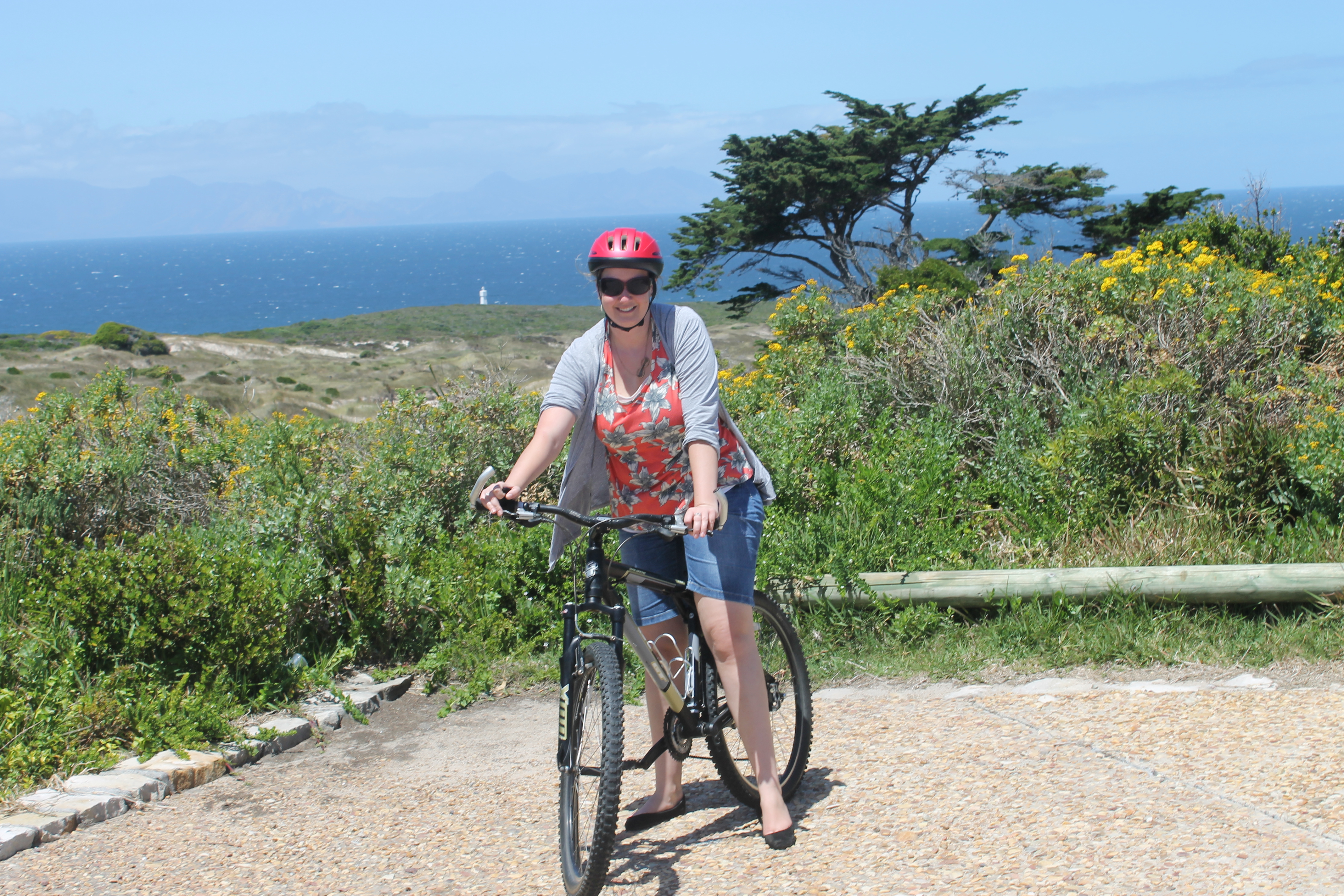 It was nearly time for lunch at this point, but before we could eat, we had to cycle 7 km, nearly reaching Cape Point. Caroline and I had not been told about this portion of the tour (the tour was just recommended by the B&B where we were staying), so we were not exactly dressed appropriately for athletics. Think sundresses and sandals. My shoes were especially not suitable for this type of thing – I’m just glad I only lost one shoe once and was able to go back and get it!