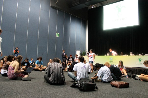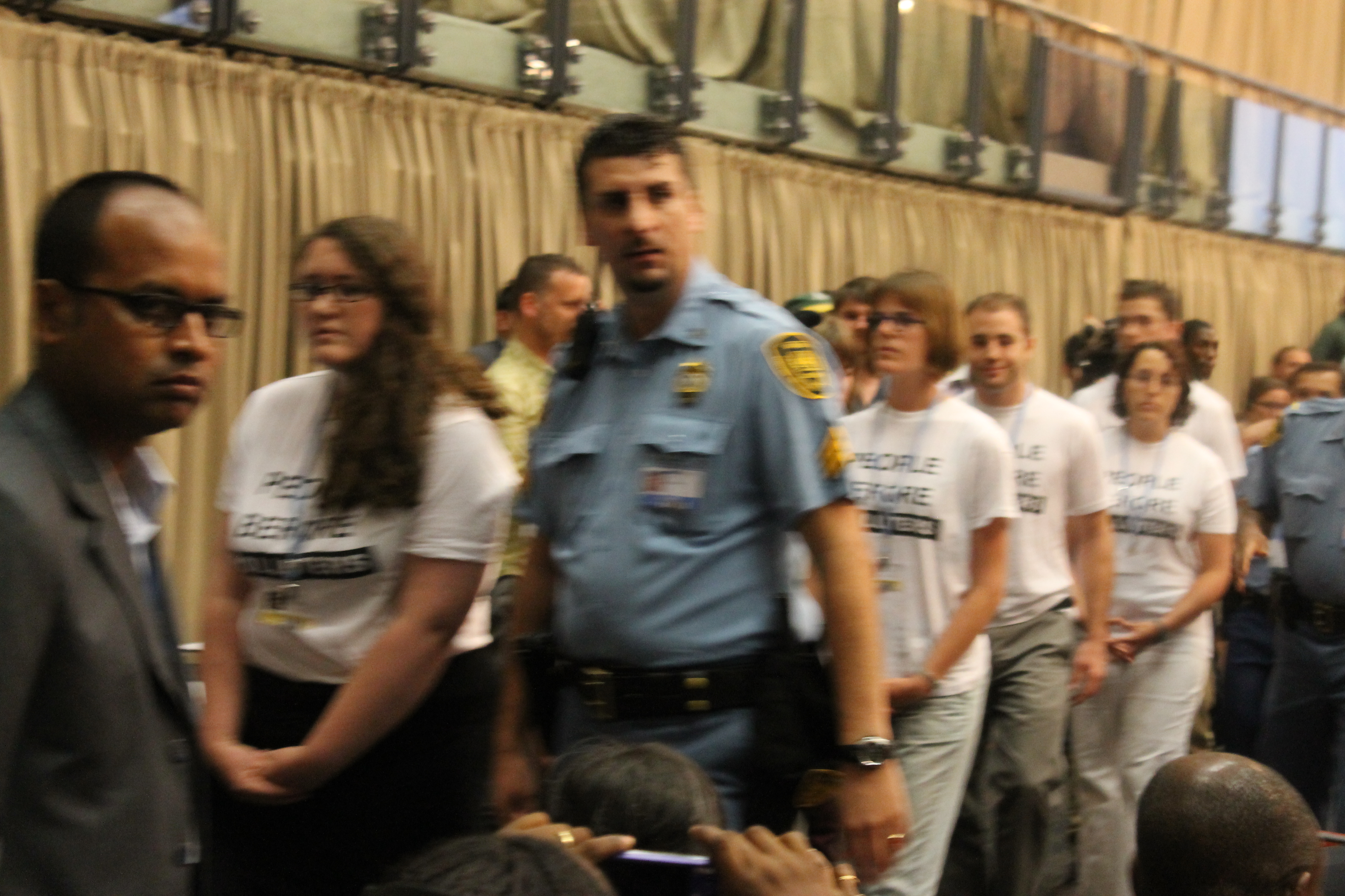 Then, later today (and I wasn’t present for this, unfortunately), an American youth, Abigail Borah, was ejected from the plenary. Willard Metzger writes about it here and the New York Times describes the scene here. And if you’re on Facebook, check out the set of photos here. And here’s a short video clip of it happening: