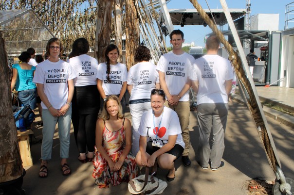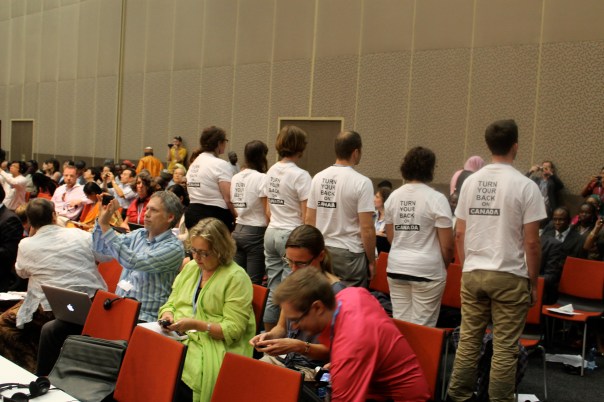 Then, when I was in the plenary, I was surprised, and seriously amused and delighted, by the action of 6 youth in the Canadian Youth Delegation who stood up in silent protest, with t-shirts that had on the front “People Before Polluters” and on the back “Turn Your Back on Canada.”